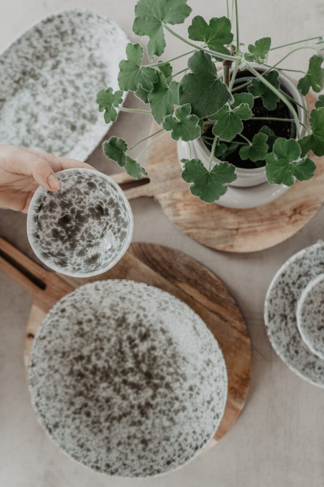 Vacker stänkmönstrat fat i glaserat stengods med en semi-matt finish. Detta fat är ett mångsidigt fat som passar perfekt till sallad eller andra maträtter. Fatet är alla tillverkat för hand vilket gör att varje skål är unik när det gäller färg, form och känsla. Färger kan därför skifta från fat till fat men som kommer göra din dukning levande och unik. Den är lika vacker på egen hand som att blanda upp och duka med andra stengodsserier.