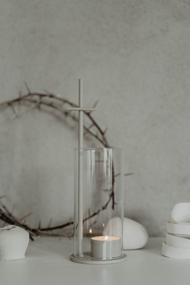 Stilren ljusstake i klarlackad stål med en glascylinder som skyddar ljuset. Korset kan även användas till handtag för att förflytta lyktan.